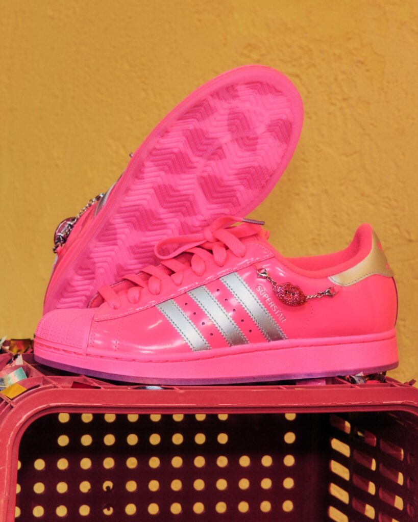 A Adidas Originals Carnaval x Boca Rosa vai muito além de um tênis personalizado. O Superstar aparece em versão rosa com detalhes prateados, acabamento vinílico e aplicações das mini-bocas, símbolo da marca Boca Rosa Beauty. O modelo mantém a silhueta clássica de 1969, mas subverte completamente o código de cores tradicional das três listras.
