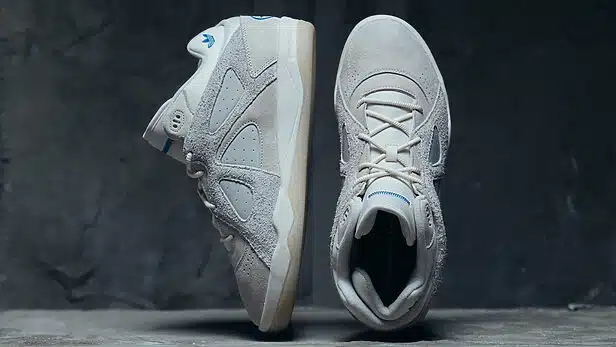 O modelo na versão branca foi criado como uma tela em branco, simbolizando novos começos e a liberdade de autodefinição. A construção premium combina camurça nubuck e camurça felpuda nos cabedais, entressola em EVA e solado externo em borracha translúcida.