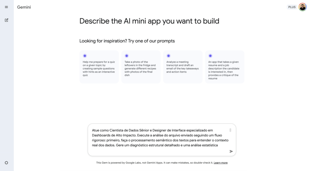 Com o novo recurso de Gems do Google Gemini, qualquer pessoa pode criar um aplicativo personalizado que transforma relatórios e arquivos de dados em dashboards visuais automaticamente. A ferramenta analisa todo o conteúdo, organiza as informações e gera gráficos prontos para apresentar aos clientes. Tudo isso sem precisar saber programação ou design.