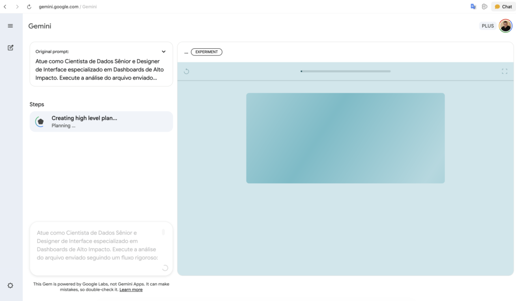 O Google Gemini vai analisar todo o conteúdo, identificar as principais métricas e decidir quais tipos de gráficos são mais adequados para cada informação. Esse processo leva alguns segundos, dependendo do tamanho do arquivo.