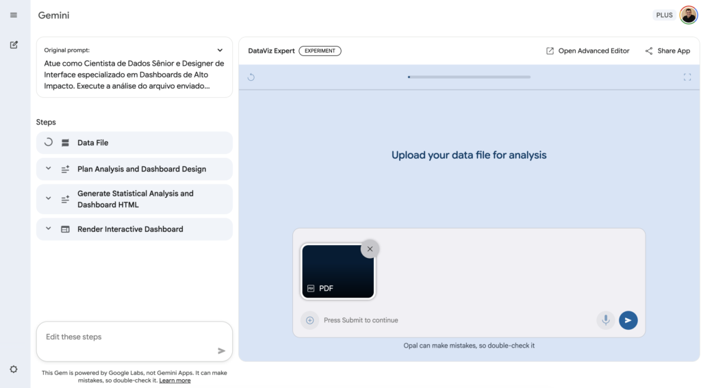 Depois que o aplicativo estiver pronto, clique em Start para ativá-lo. Em seguida, faça o upload do arquivo com os dados. Não é necessário dar nenhum comando adicional ou explicar o que fazer. O sistema já sabe que precisa processar o arquivo e criar o dashboard.