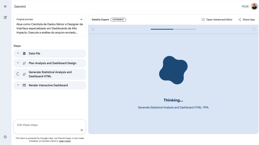 O prompt deve orientar o Gemini a criar gráficos, tabelas e organizar as informações de forma visual e profissional. Depois de inserir as instruções, o sistema começa a processar e criar o aplicativo automaticamente.