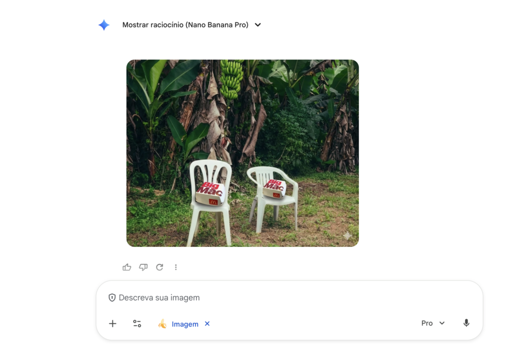 Para marcas de moda: “Substitua as cadeiras por dois vestidos da minha coleção de verão, posicionados como se estivessem sentados, mantendo a cena com bananeiras.”