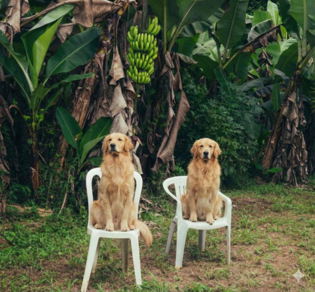 Para pet shops: “Coloque dois cachorros golden retriever sentados no lugar das cadeiras, em uma cena natural com as bananeiras ao fundo.”