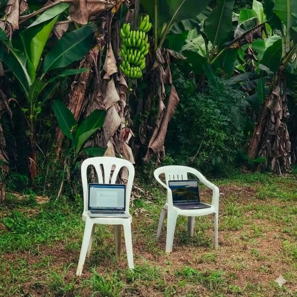 Para marcas de tecnologia: Coloque dois notebooks abertos em cima das cadeiras, com telas visíveis, na mesma composição com bananeiras.