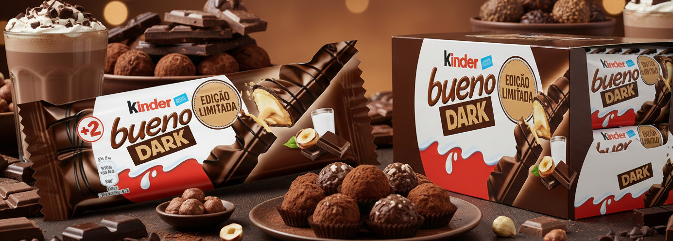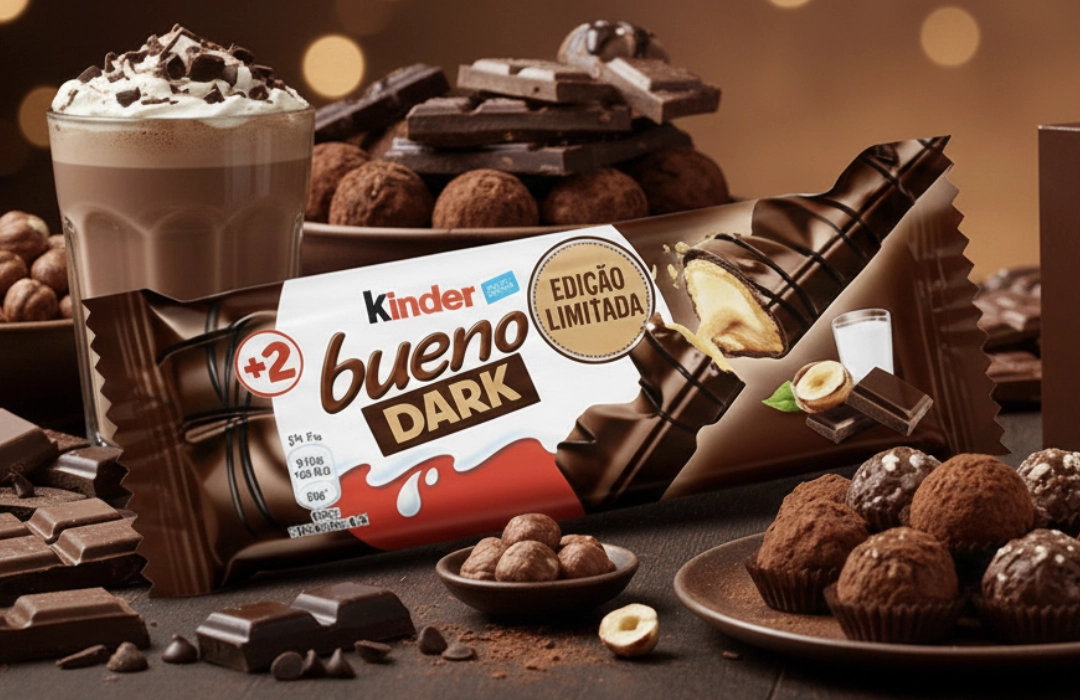 Kinder Bueno Dark desembarca no Brasil em edição limitada a partir de fevereiro de 2026, trazendo ao mercado nacional uma versão inédita do clássico wafer da Ferrero. A novidade combina a cobertura de chocolate meio amargo com o recheio cremoso de leite e avelã e o wafer crocante que já consagraram a linha no país. O lançamento integra a campanha de Páscoa 2026 da marca e chega para ampliar um portfólio que já conta com as versões ao leite e branco.