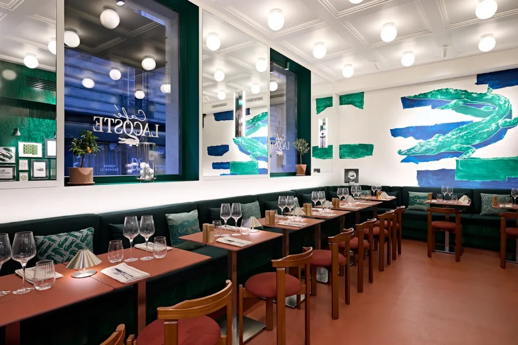 O Café Lacoste ocupa um espaço de 100 m² na Avenue Franklin Delano Roosevelt, a poucos metros da flagship store nos Champs-Élysées. Com capacidade para 65 lugares, o estabelecimento funciona como extensão física do universo da marca, conectando produto, design, gastronomia e experiência em um único ponto de contato.