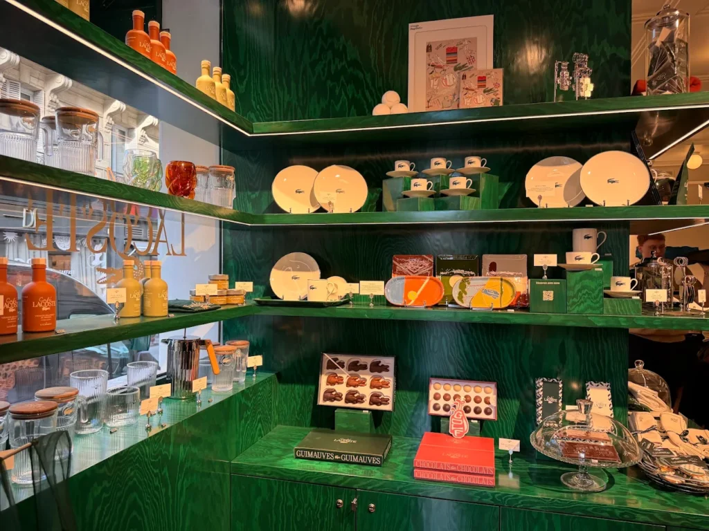 A ambientação traduz os códigos visuais da Lacoste em arquitetura. Tons de verde profundo, branco e terracota, combinados com linhas inspiradas no tênis, criam um ambiente que comunica os valores de esporte, elegância e herança francesa. O espaço também opera como loja-conceito, oferecendo produtos de mercearia fina, porcelanas e uma linha têxtil exclusiva.