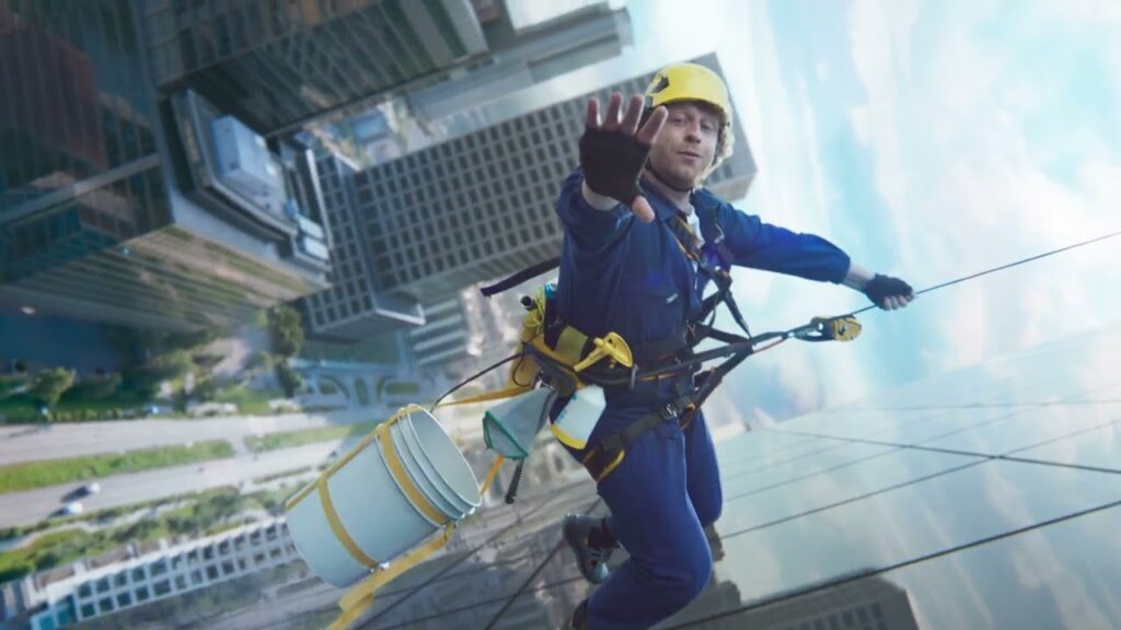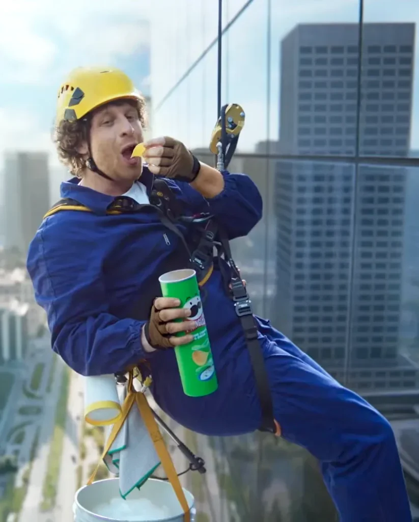 O filme central da campanha “Pass the Pringles” tem como protagonistas dois limpadores de janelas que, suspensos em equipamentos de segurança na fachada de um prédio alto, tentam se passar o icônico tubo de batatas enquanto dançam e realizam acrobacias. A cena une humor, leveza e movimento de forma precisa, sem forçar o roteiro.