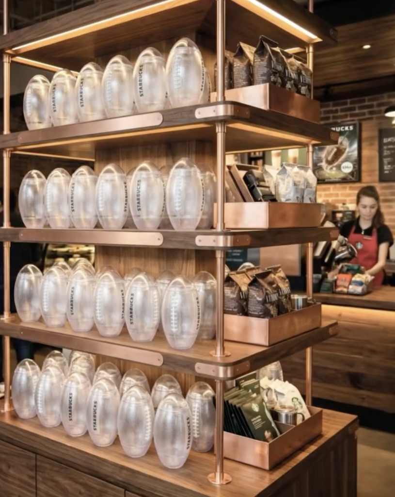 A integração aos displays das lojas foi cirúrgica. Os copos não apenas estavam disponíveis para compra, mas faziam parte da decoração temática de Super Bowl que transformou cafeterias selecionadas em verdadeiros santuários do evento esportivo.