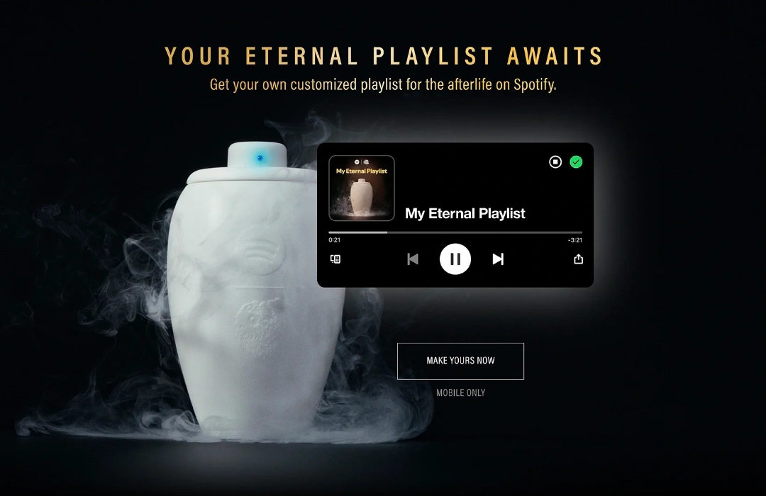 O grande diferencial da Urna Funerária Spotify reside na sua integração com o Eternal Playlist Generator, uma ferramenta desenvolvida pelo Spotify exclusivamente para ouvintes nos Estados Unidos. Este gerador cria playlists personalizadas com base nos hábitos de escuta do usuário e em respostas a perguntas temáticas e bem-humoradas, como “Qual é a sua música para se preparar para assombrar?” e “Qual é a sua vibe eterna?”. A playlist resultante é cuidadosamente compilada para refletir a personalidade e o gosto musical do indivíduo, oferecendo uma representação sonora autêntica de sua vida.