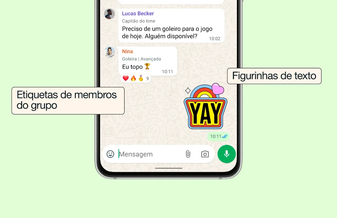 O WhatsApp também introduziu a criação de figurinhas diretamente a partir de texto digitado. Os usuários podem escolher entre diferentes fontes, cores de fundo e estilos visuais, transformando frases em stickers personalizados sem precisar de aplicativos externos. A funcionalidade está disponível na seção de figurinhas, com opções de edição que incluem ajuste de tamanho e posicionamento do texto.